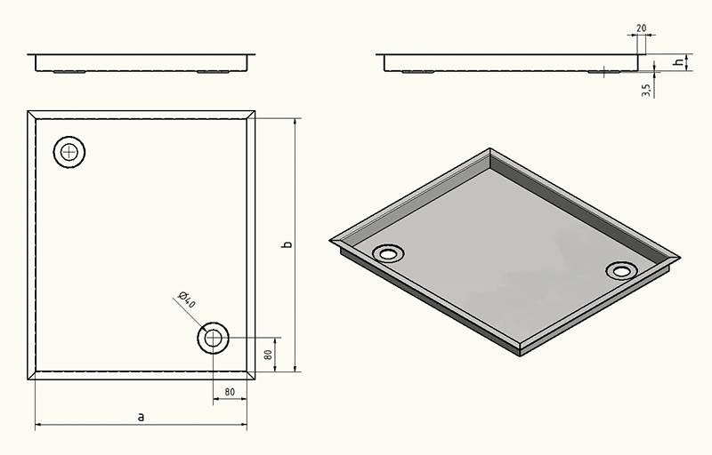 Edelstahl Duschwanne, Duschtasse { R3A } 1,5mm umlaufender Rand 20mm, INNEN Schliff K320, Tiefe ab 500 mm, Breite ab 600 mm, 1 oder 2 Ablaufbohrungen, verschiedene Höhen