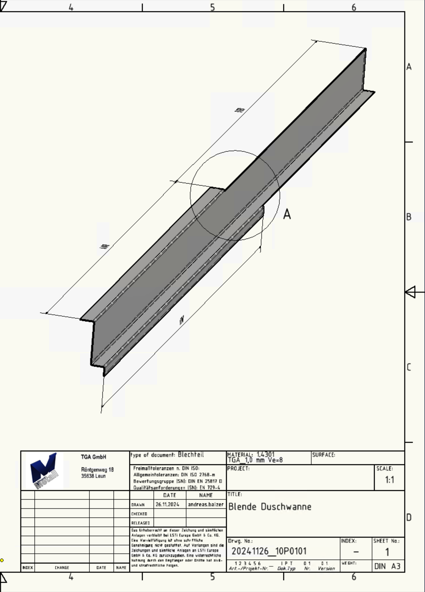 Sonder Edelstahlblende, Oberfläche einseitig geschliffen K320, mit Schutzfolie, Maße 45x29x ca. 1020mm, t= 1,0 mm - nach Skizze