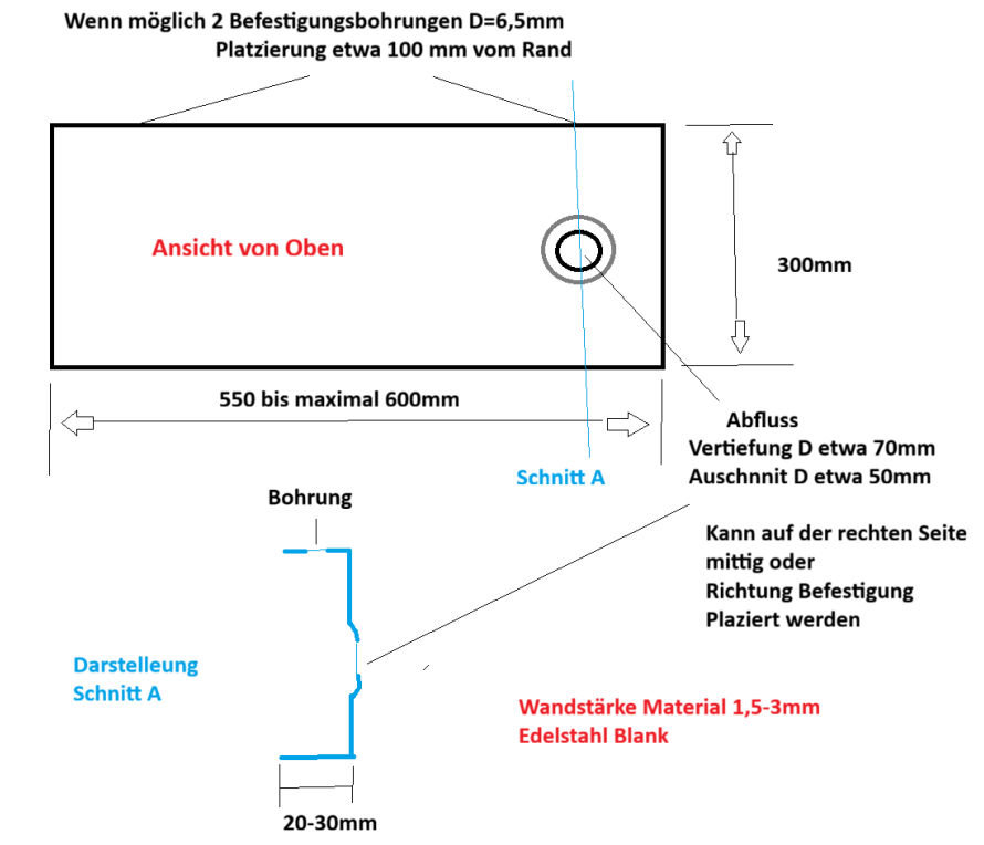 Bac spécial en acier inoxydable, {R1A-1} 1,5 mm, finition intérieure K320, profondeur 300 mm, largeur 600 mm, 1 trou d'évacuation dans l'angle, hauteur 30 mm, 2 trous de fixation d=6,5 mm