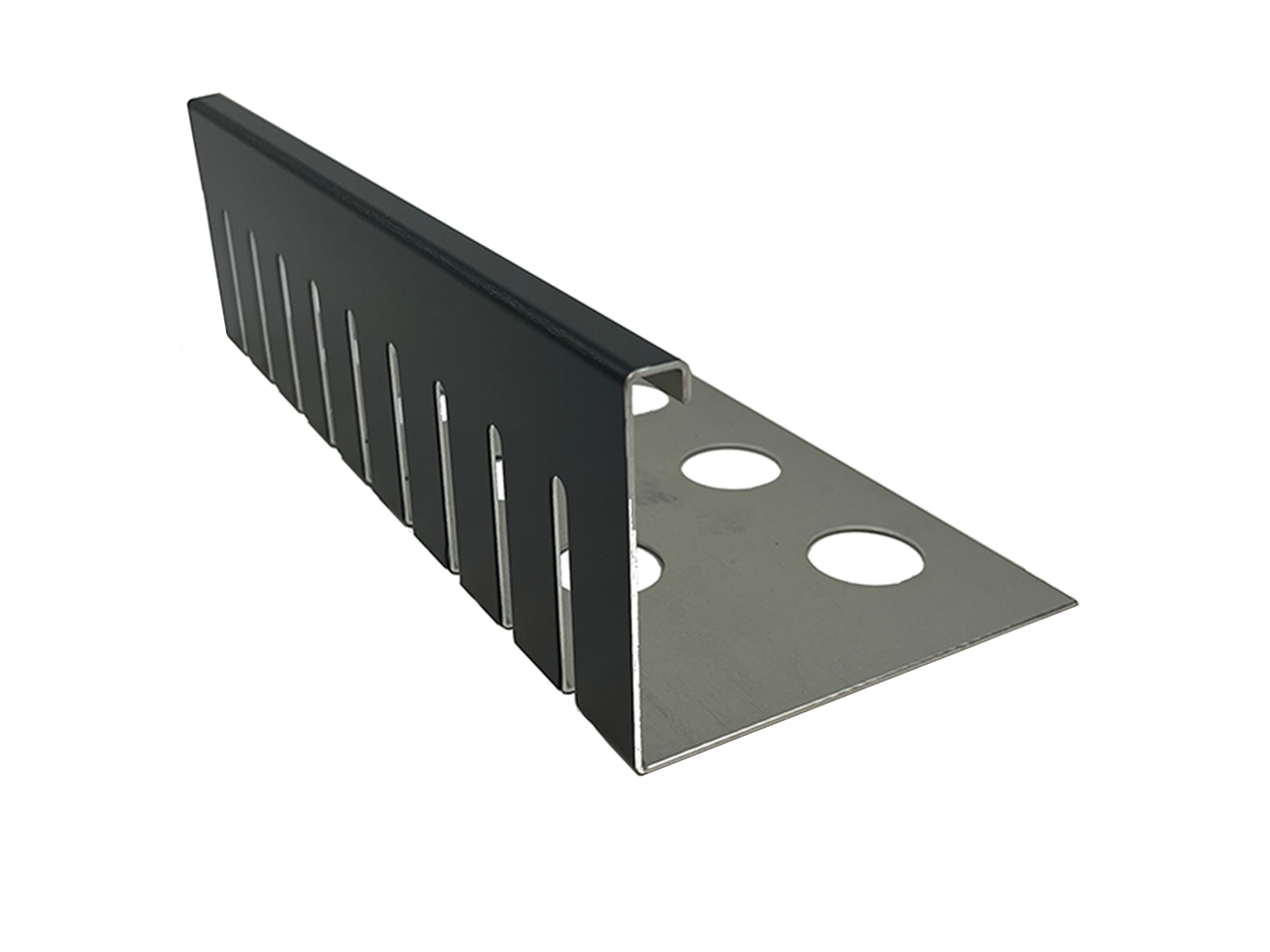 Bande pare-gravier - aluminium anthracite (similaire à RAL 7016) ou anodisé. (E6/EV1) Hauteur 40 à 75mm – Perforé – Coudé à 90°. Bandes récupératrices de gravier de haute qualité pour retenir les matériaux en vrac, gravier ou granulés, et pour évacuer les