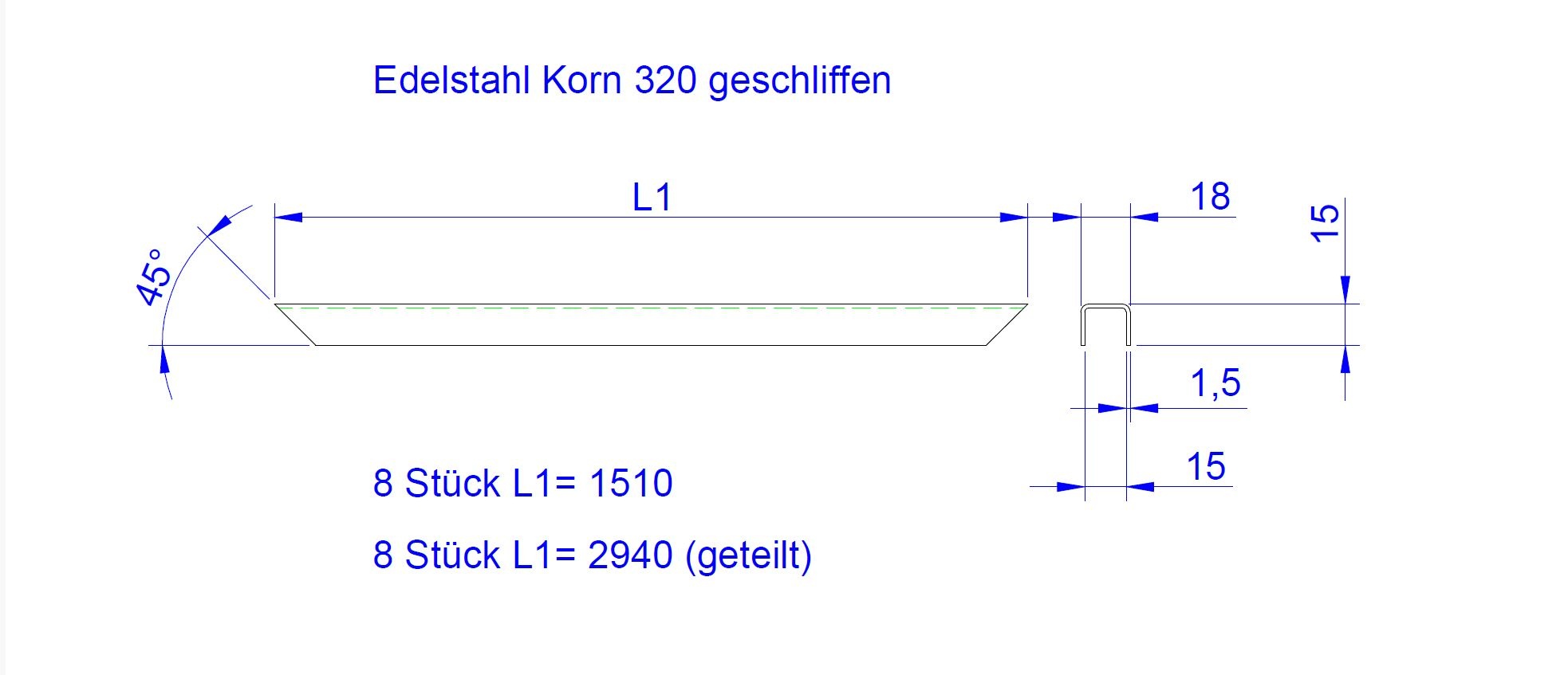 Ensemble de 26 profilés en U extérieurs en acier inoxydable grain 320, épaisseur 1,5 mm, dimensions 15 x 18 x 15 mm, coupe en biseau. Pour 4 cadres extérieurs de 8 x 1510 mm et 8 x 2940 mm (divisé), et 1 cadre intérieur de 6 x 644 mm et 4 x 322 mm.