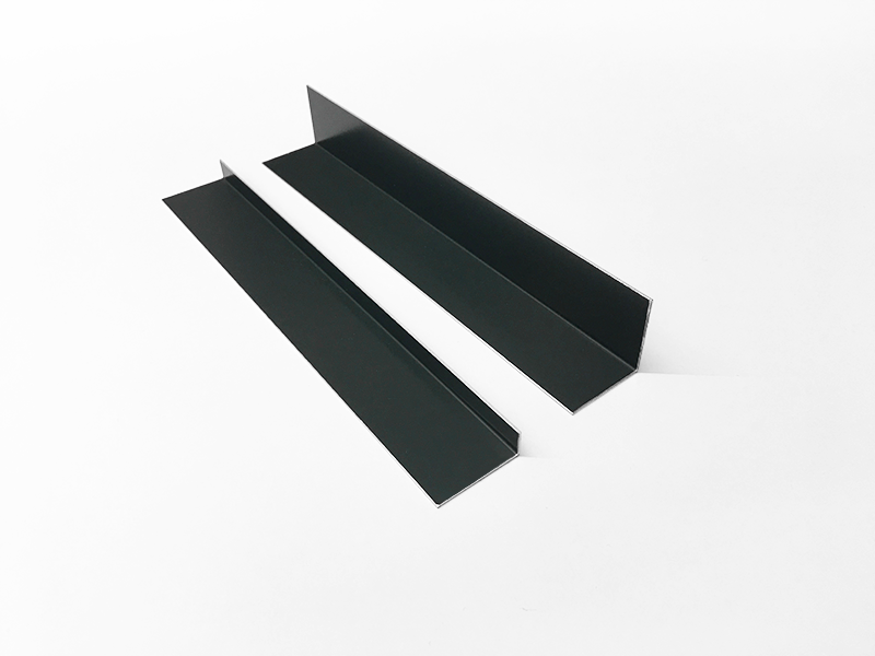 Ensemble de cornières en aluminium anthracite, à côtés égaux, pliées à 90°, face visible (extérieure) : 8 × 20 × 55 × 2420 mm, 2 × 20 × 65 mm. Face visible (intérieure) : 15 × 45 × 2350 mm