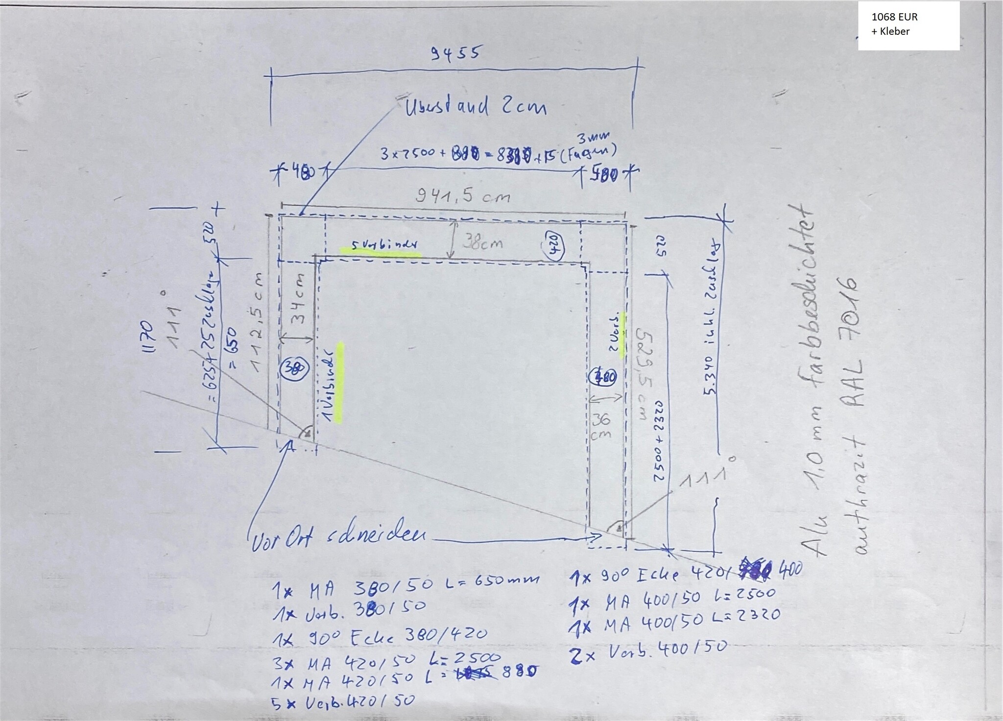 Profilé mural spécial en aluminium, similaire à l'anthracite RAL 7016, largeur 380-420 mm, hauteur 50 mm, 1 x 380 x 650 mm, 1 x angle à 90° 380/420, 1 connecteur, 3 x MA420/50 x 2500, 1 x MA420/50 x 880, 5 connecteurs, 1 x angle à 90° 420/400, 1 x MA400/5