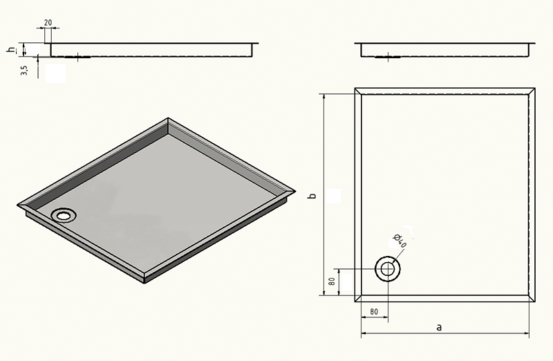 Receveur de douche spécial en acier inoxydable, base de douche {R3A} 1,5 mm, ponçage INTÉRIEUR K320, dimensions avec bord : 590x630 mm, profondeur intérieure 80 mm, bord périphérique selon croquis, évacuation en haut à droite.