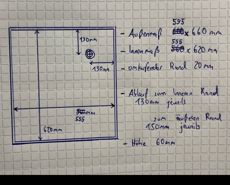 Receveur de douche spécial en acier inoxydable, base de douche {R3A} 1,5 mm, ponçage INTÉRIEUR K320, dimensions avec bord : 590x630 mm, profondeur intérieure 80 mm, bord périphérique selon croquis, évacuation en haut à droite. - Copy