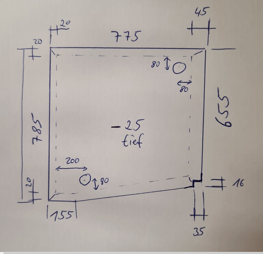 Receveur de douche spécial en acier inoxydable, receveur de douche { R3A } 1,5 mm, meulage INTÉRIEUR K320, dimensions avec bord : 655x785 mm, hauteur 25 mm, bord périphérique selon croquis, y compris 2x raccords de vidange Dometic 90°