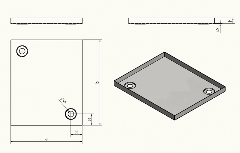 Receveur de douche spécial en acier inoxydable, base de douche {R1A-1} 1,5 mm, finition intérieure brossée K320, profondeur 700 mm, largeur 1200 mm, 2 orifices d'évacuation dans les angles, hauteur 30 mm