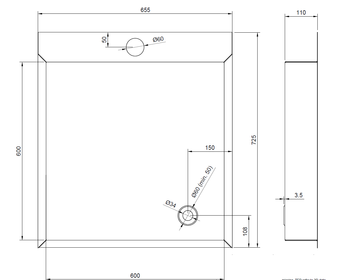 Receveur de douche spécial en acier inoxydable, receveur de douche {R3A} 1,5 mm, meulage INTÉRIEUR K320, dimensions avec bord : 655x725 mm, profondeur 110 mm, bord périphérique 27,5 mm selon croquis, bonde en bas à droite