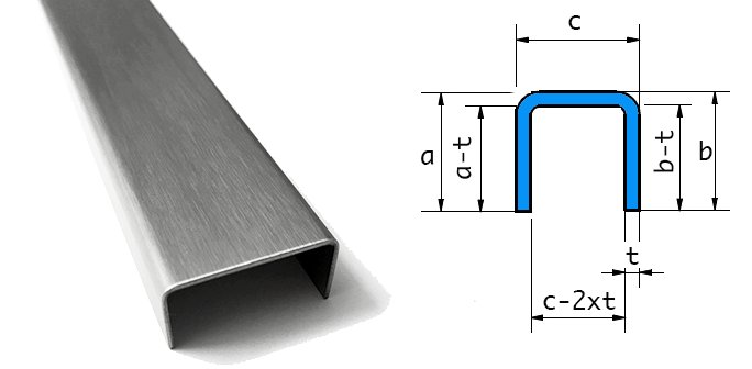 RESTE [19B] Profilé en U en acier inoxydable, double pli, épaisseur 1,0 mm, dimensions (ax x c x l) 30 x 30 x 30 mm, longueur 2000 mm, finition extérieure K320