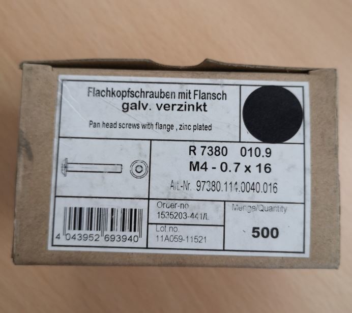 STOCK RESTANT Résolution du stock : 500 pièces, vis à tête cylindrique bombée avec bride, électrozinguées, M4 - 0,7 x 16, différents fabricants : la photo est à titre d'illustration et les boîtes peuvent être endommagées.