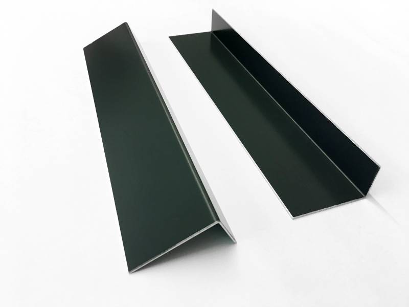 Hoek van aluminium, eenvoudig gevouwen, aan één zijde gecoat met antraciet (vergelijkbaar met RAL 7016) in verschillende diktes en afmetingen. U kunt de gewenste lengte invoeren tot een maximum van 1500 mm in het onderstaande vak.