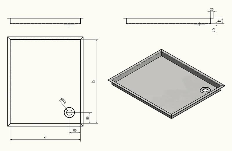 Douchebak van roestvrij staal, douchebak { R3A } 1,5 mm rondom rand 20 mm, INTERNE slijping K320, diepte vanaf 500 mm, breedte vanaf 600 mm, 1 of 2 afvoergaten, diverse hoogtes