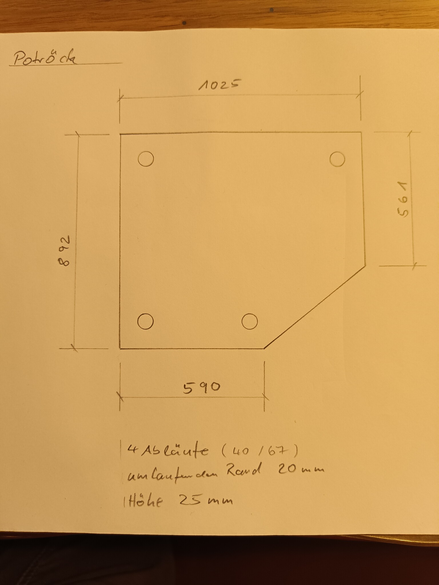 Speciaal - Douchebak van roestvrij staal, douchebodem {R3A} 1,5 mm, binnenafwerking K320, afmetingen 892 x 1025 mm, inclusief 20 mm rand, hoogte 25 mm, volgens schets