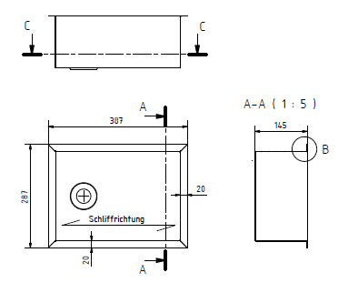 RVS wastafel, camperverlenging {R3B} 1,5 mm omtreksrand 20 mm, BINNEN slijpen K320, breedte 320 mm, incl. Rand 357 mm, lengte 410 mm, incl. Rand 447 mm, diepte 150 mm