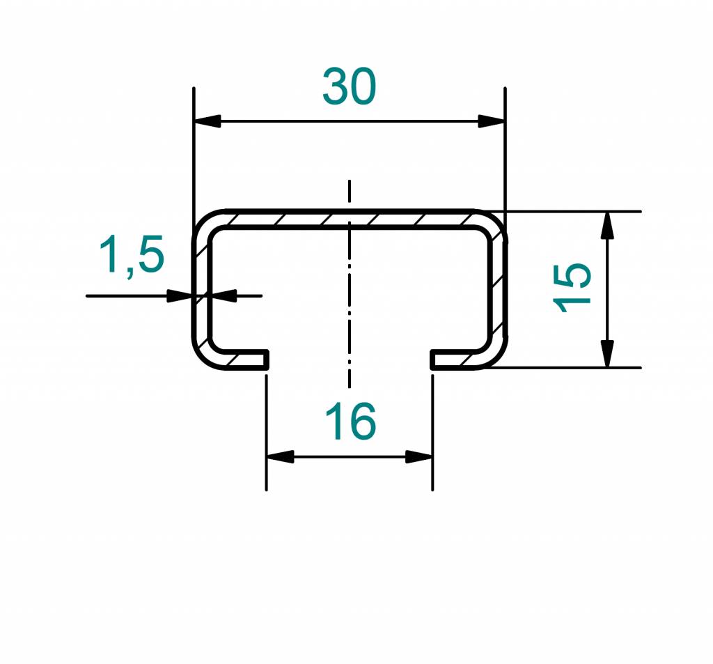 Economy set C-profiel klein geborsteld, hoogte 15mm breedte c= 30mm lengte 1250mm gemaakt van 1,5mm RVS K320