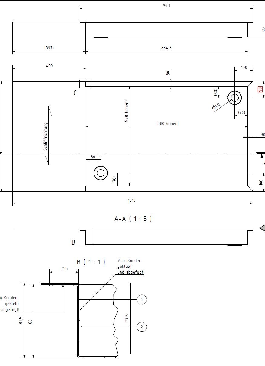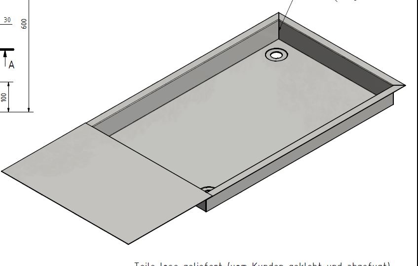 RVS douchebak, 2-delig {R4A}, materiaaldikte 1,5mm, INSIDE cut K320, afmetingen 884,5x543mm (plus 30mm rand), hoogte 80mm, 2 afvoergaten