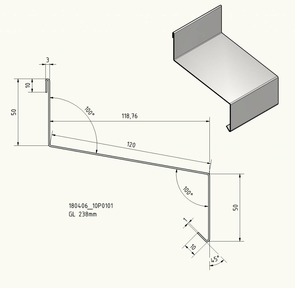 Traufblech roestvrij staal 1.4301 buiten K320 50/120/50, 1.0mm patroonlengte 100mm, lengtes 1000, 1500 2000mm