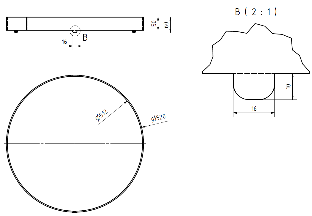Wog-ring, diameter 520 mm, gemaakt van gepolijst roestvrij staal, hoogte 50 + 10 mm.